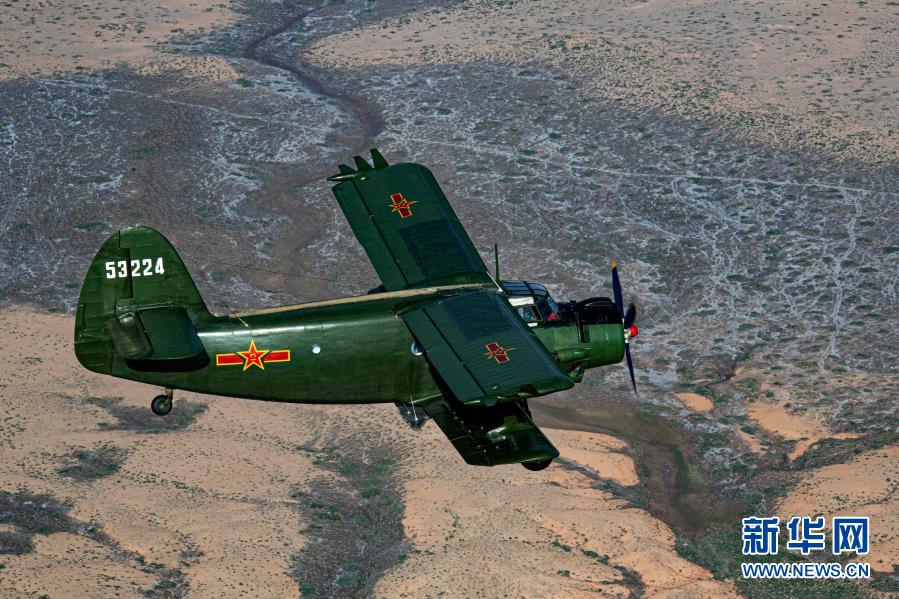 西部战区空军运输搜救航空兵某团运-5型运输机穿越荒漠地带,飞赴预定空域展开飞播作业(2020年6月9日摄)。
