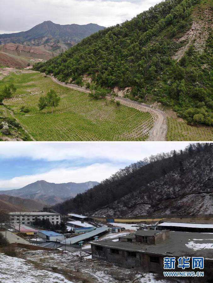 拼版照片:上图为甘肃省武威市天祝藏族自治县千马龙煤矿旧址现貌(2019年6月17日摄);下图为甘肃省武威市天祝藏族自治县千马龙煤矿旧址原貌(资料照片)。