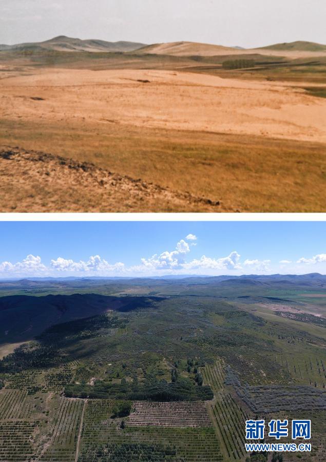 拼版照片:上图是翻拍的内蒙古自治区多伦县多伦诺尔镇新民村村民马云平承包的沙地(2000年资料照片);下图为2018年8月10日拍摄的沙地治理之后的场景。