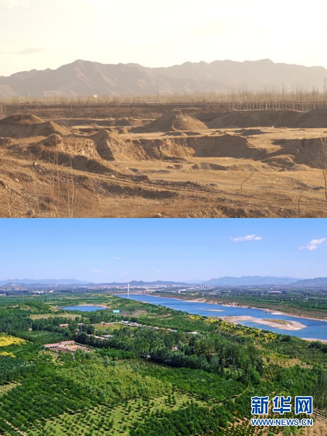 拼版照片:上图为治理前的北京怀柔潮白河流域(2012年摄);下图为治理后的北京怀柔潮白河流域(2018年摄)。