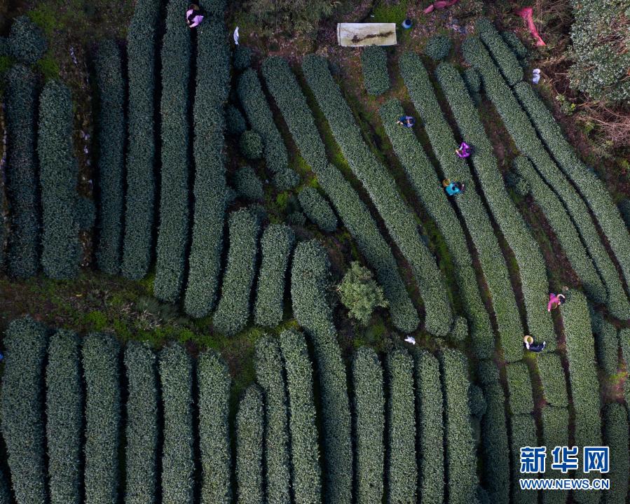 3月12日,在位于杭州市西湖风景名胜区满觉陇村白鹤峰的西湖龙井茶叶基地,茶农在采摘西湖龙井头茶(无人机照片)。