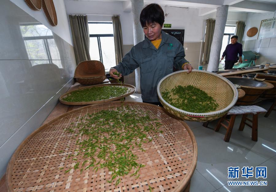 3月12日,在杭州市西湖风景名胜区满觉陇村的中国茶叶博物馆满觉陇炒茶中心内,茶农把西湖龙井茶鲜叶进行摊青。