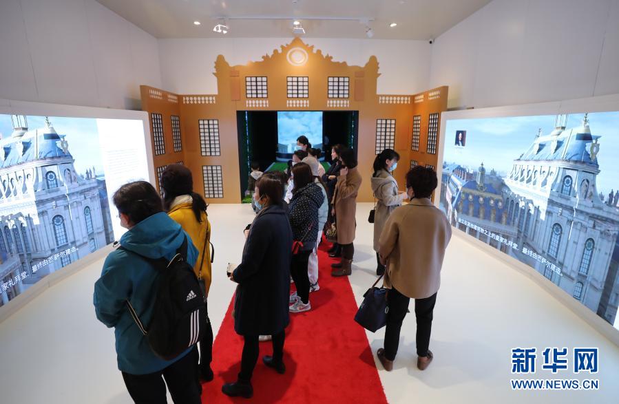 3月12日,参观者在展览入口处观看介绍凡尔赛宫建筑历史的视频。新华社记者 方喆 摄