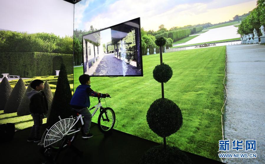 3月12日,小朋友在体验单车骑行“游览”凡尔赛宫的互动游戏。新华社记者 方喆 摄
