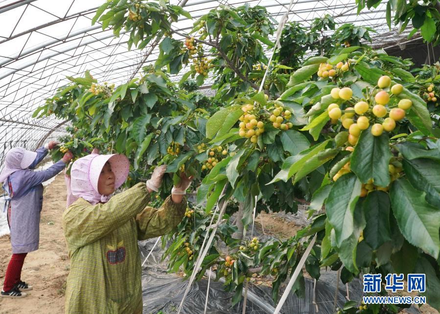 3月12日,在唐山市丰南区钱营镇一家生态种植基地,农民在大棚内管护樱桃。新华社记者 杨世尧 摄