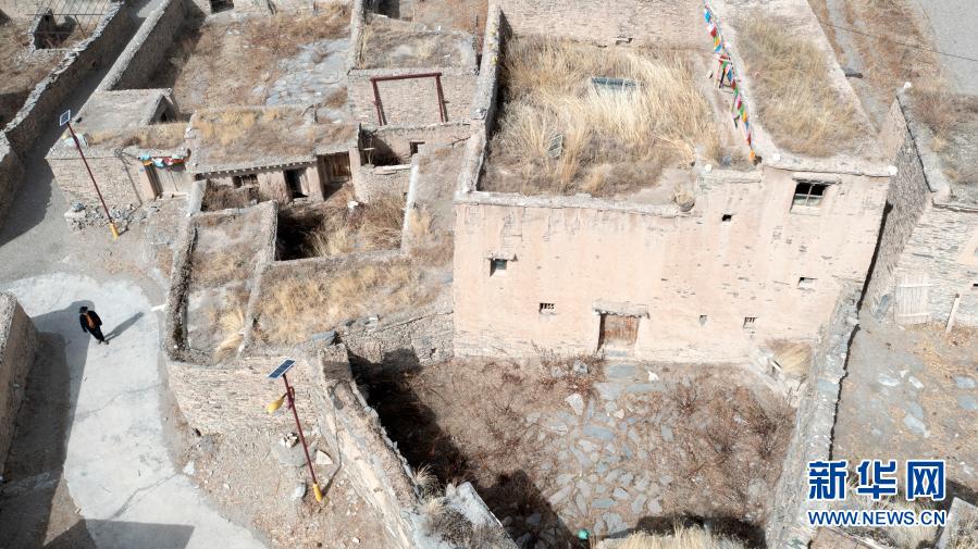3月9日,在称多县拉布乡郭吾村,尼玛在郭吾古堡内寻访(无人机照片)。新华社记者 张宏祥 摄