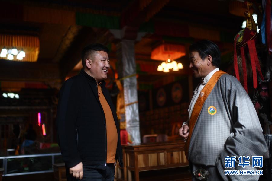 3月9日,在称多县拉布乡拉司通村,尼玛(左)和巴才仁商量打造游客接待中心的计划。新华社记者 张宏祥 摄