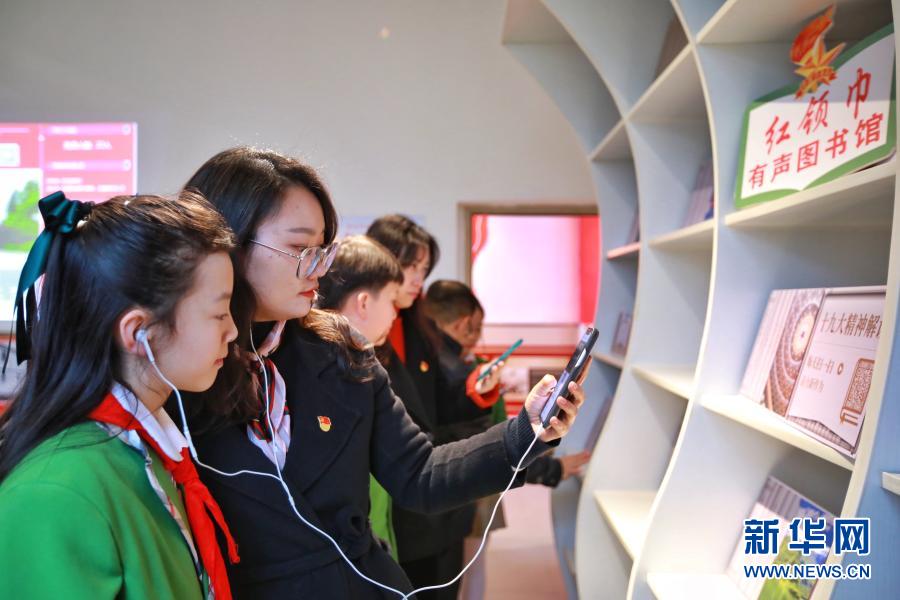 3月12日,贵阳市云岩区芳草地国际学校学生在教师带领下在体验馆听有声党史读物。新华社记者 刘续 摄
