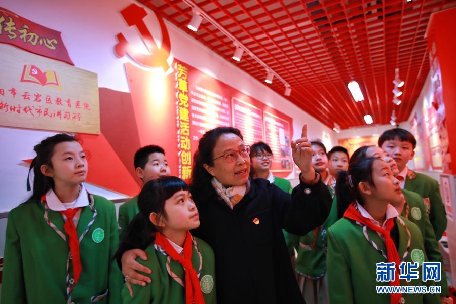 3月12日,贵阳市云岩区芳草地国际学校学生在教师带领下在体验馆学习党史。新华社记者 刘续 摄