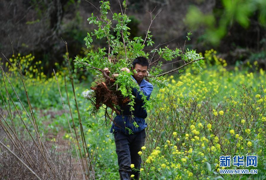 在广西柳州市融安县东起乡崖脚村铜板屯,村民龙革雄扛着树苗上山种植李树(3月7日摄)。新华社记者 黄孝邦 摄
