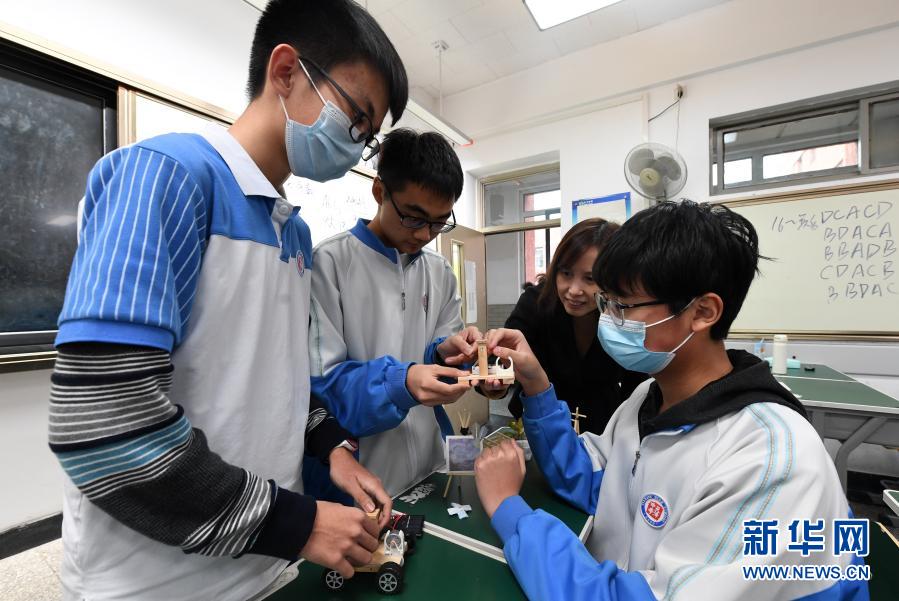 3月12日,天津中学学生在老师指导下利用废物进行手工制作。新华社记者 赵子硕 摄