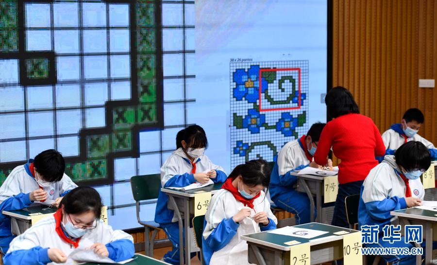 3月12日,天津中学学生在刺绣制作比赛中。新华社记者 赵子硕 摄