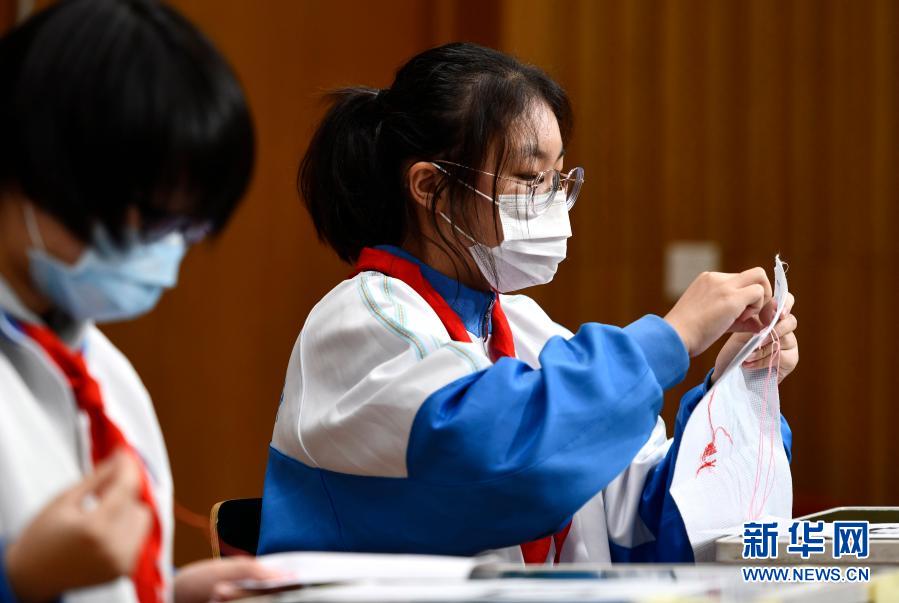 3月12日,天津中学学生在刺绣制作比赛中。新华社记者 赵子硕 摄