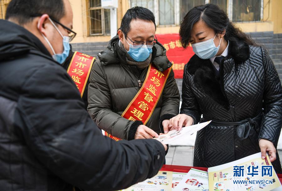 3月12日,乌鲁木齐市市场监督管理局执法稽查科科长牟海斌(中)在活动现场为辖区居民宣传消费维权相关法律法规。