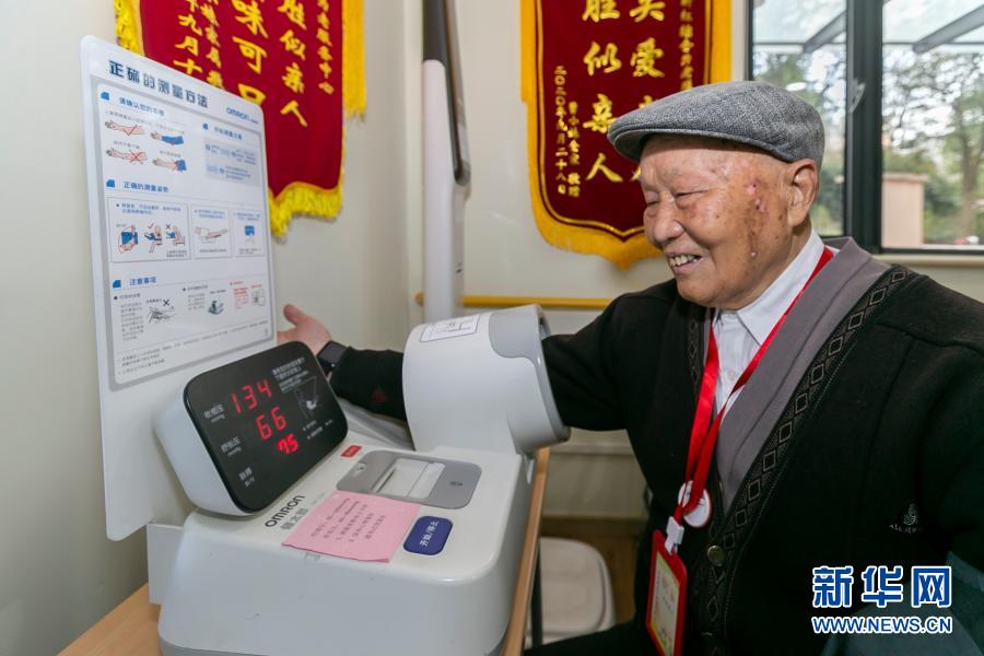 3月12日,爱博四村88岁老人吴福全在新虹街道综合为老服务中心免费体验脉搏和血压检测。