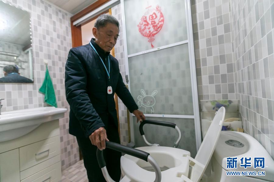 3月12日,爱博一村91岁老人陆生余在家中展示适老化改造后的厕所。