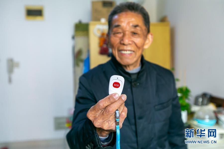3月12日,爱博一村91岁老人陆生余在家中展示紧急呼叫设备。