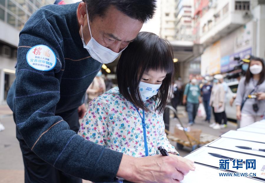 3月12日,在香港湾仔,周先生带着6岁的女儿来到签名桌前和女儿一起写下名字。新华社记者 王申 摄