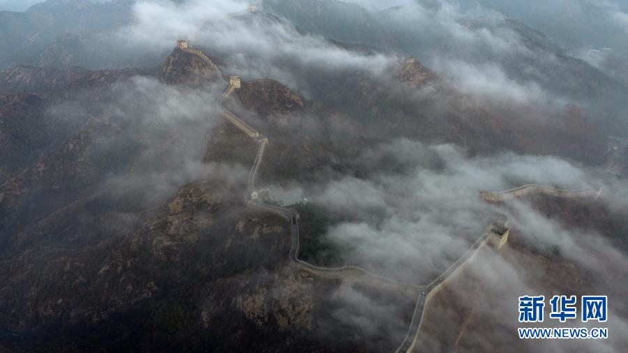 这是3月13日在金山岭长城拍摄的云海景观(无人机照片)。新华社发(王立群 摄)