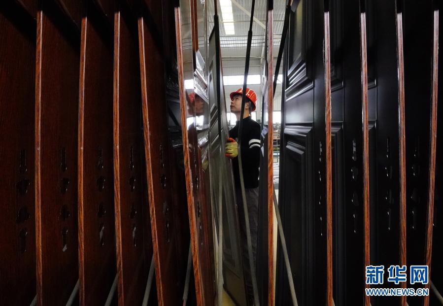 3月13日,工人在唐山市丰润区一家金属门企业生产车间工作。