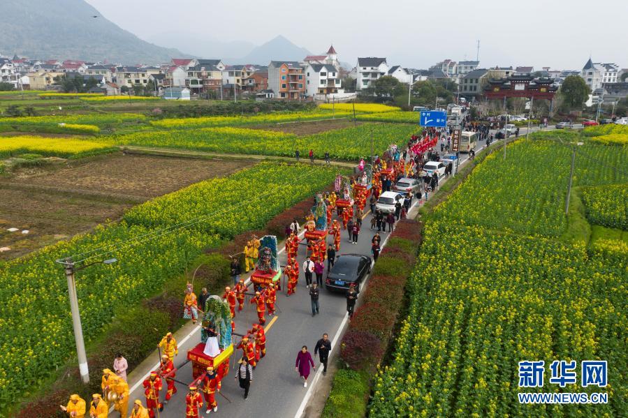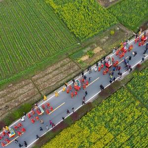 3月13日,参加抬阁展演的表演队伍在乡村道路上行进(无人机照片)。