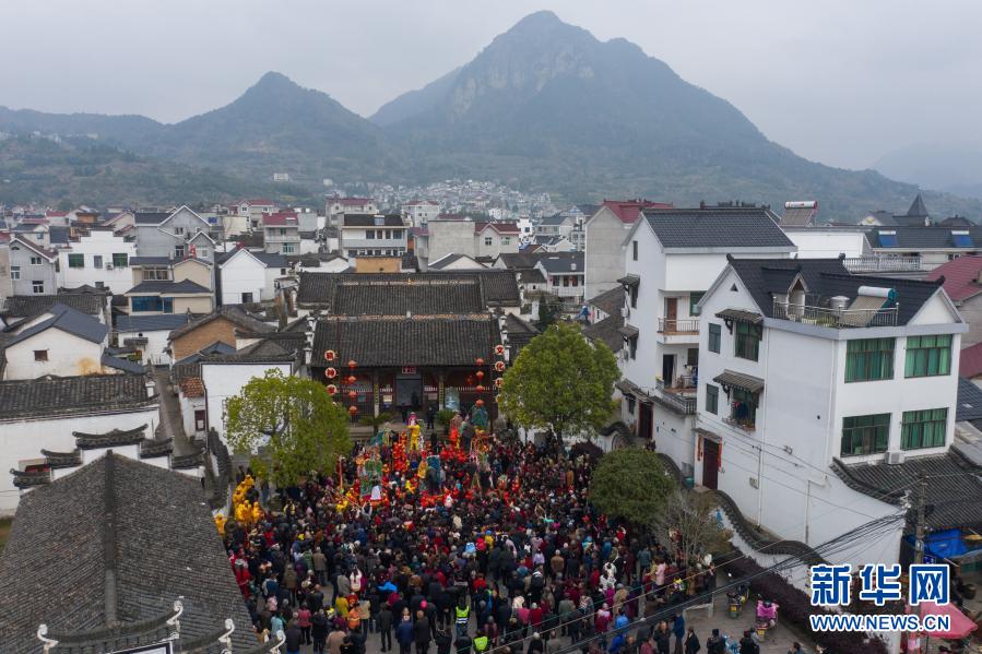 3月13日,参加抬阁活动的人们集中在村祠堂前(无人机照片)。
