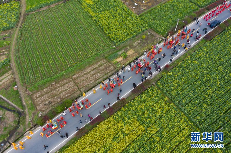 3月13日,参加抬阁展演的表演队伍在乡村道路上行进(无人机照片)。