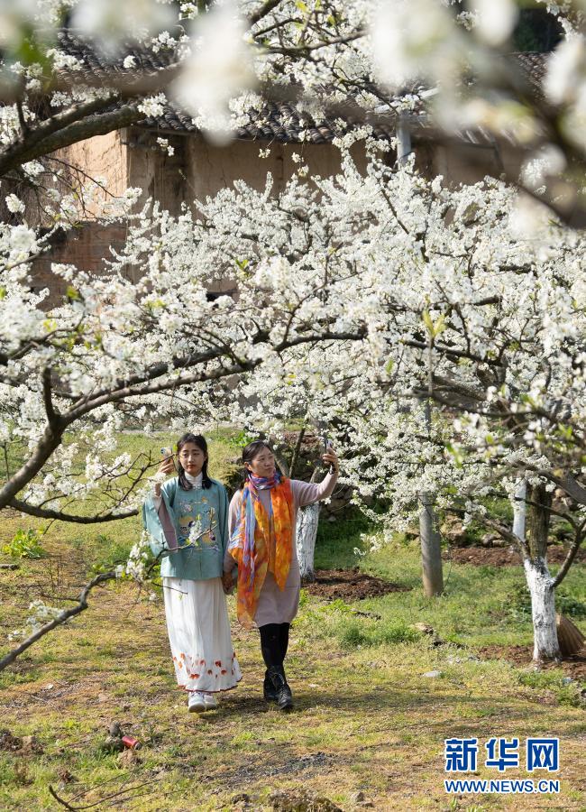 3月13日,游客在秭归县沙镇溪镇高潮村踏青赏花。新华社发(梅雪飞 摄)