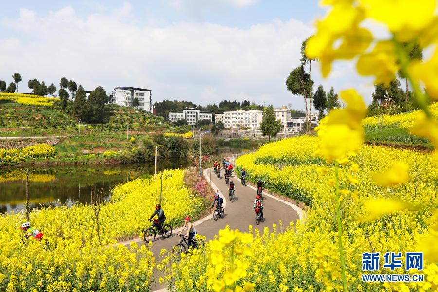 3月13日,重庆市梁平区柏家镇红卫湖生态湿地公园,骑行爱好者在环湖健身步道上骑行。新华社发(刘辉 摄)