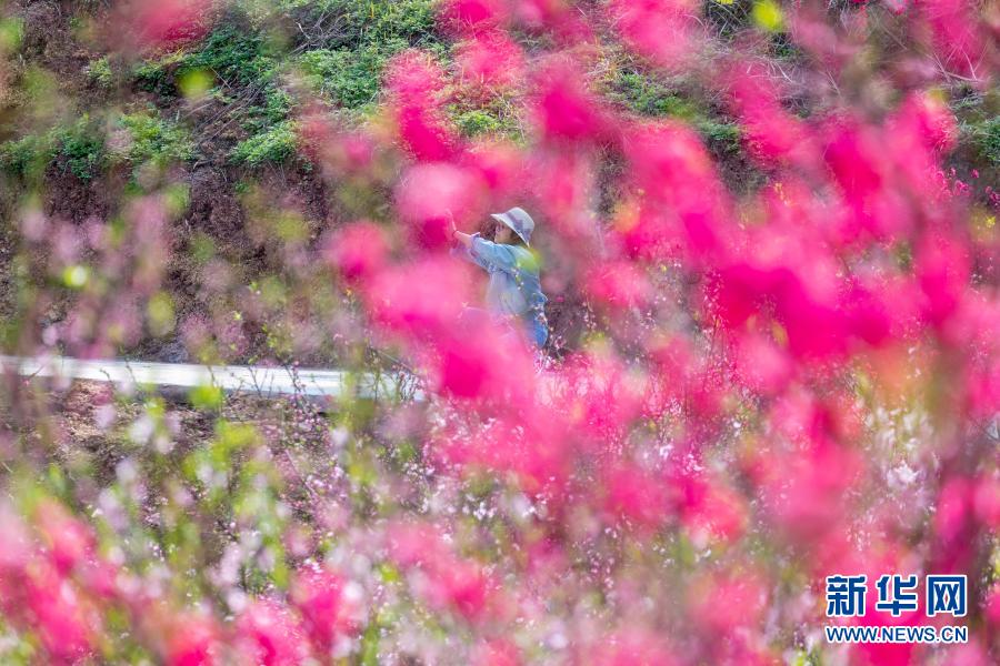 3月11日,游客在重庆市南川区西城街道来游社区欣赏盛开的桃花。新华社发(瞿明斌 摄)