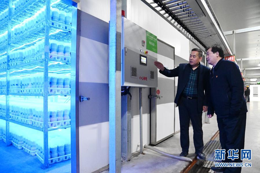 3月12日,新乡市星河生物科技有限公司的负责人为赵化录(右)讲解智能化育菇的发展情况。新华社记者张浩然摄
