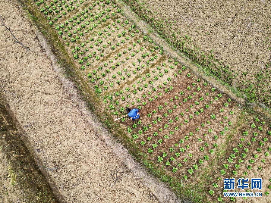 3月13日,遵义市汇川区团泽镇农民在田间劳作(无人机照片)。新华社发(罗星汉 摄)