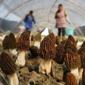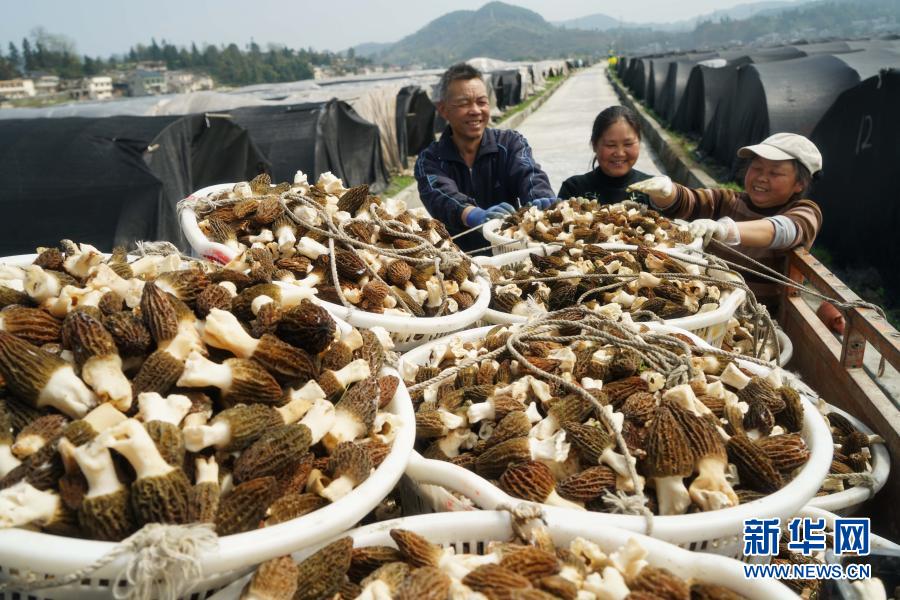 3月13日,在遵义市红花岗区海龙镇羊肚菌种植基地,农民将采摘好的羊肚菌装车。