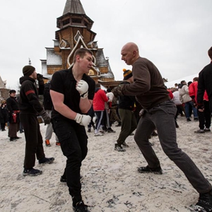 3月13日,在俄罗斯首都莫斯科,人们在谢肉节庆祝活动中将一名女子抛起。