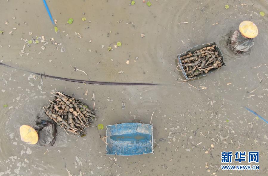 在广东台山汶村镇老黎村,采藕工在挖藕(3月12日摄,无人机照片)。新华社记者 邓华 摄