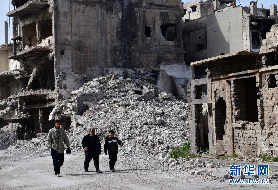3月11日,叙利亚霍姆斯居民走过被战火损毁的建筑。