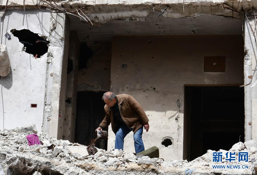3月11日,叙利亚霍姆斯老人哈迪·古松在被炸毁的自家房屋寻找旧物。