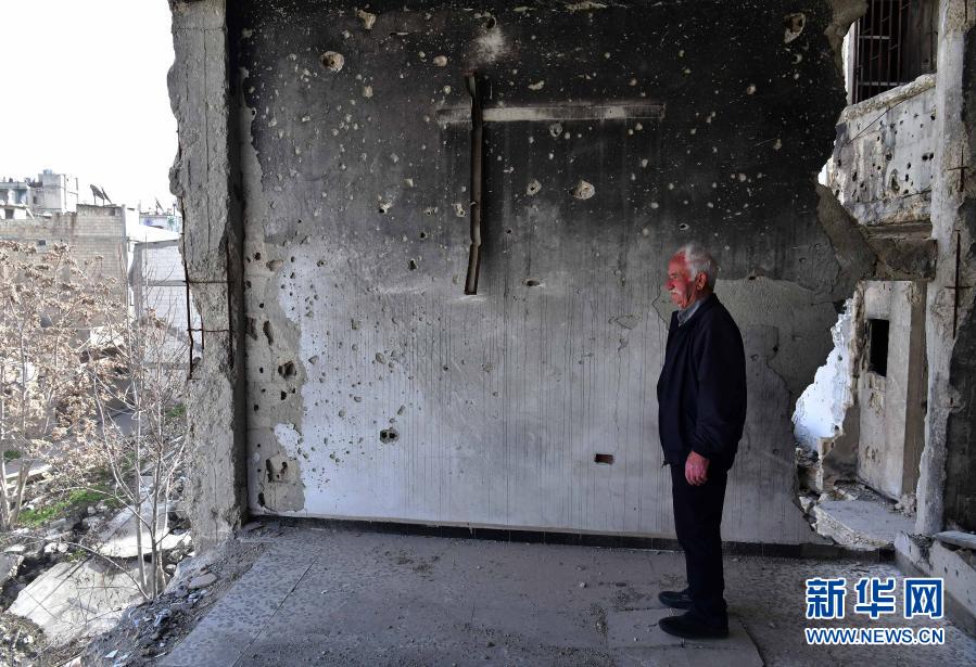 3月11日,叙利亚霍姆斯老人纳伊姆·路易斯站在被战火破坏的房屋中。