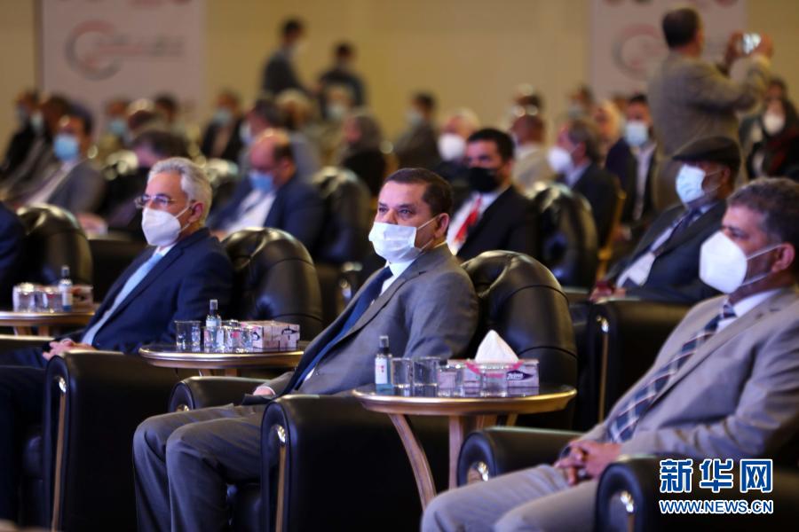 3月13日,新的民族团结政府总理德贝巴(中)在利比亚的黎波里参加疫情防控会议。