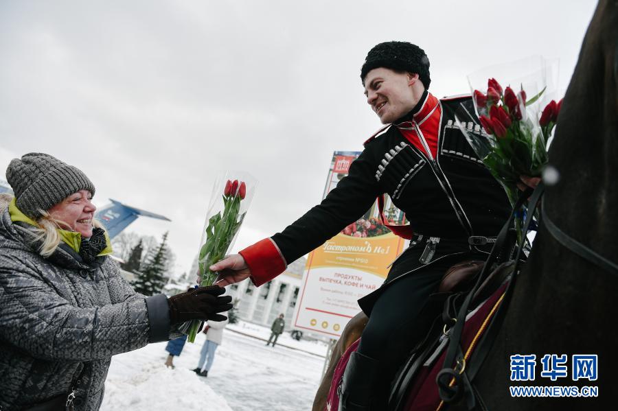3月8日,骑手在俄罗斯首都莫斯科向参观者赠送鲜花。3月8日,克里姆林宫骑术学校的骑手在国民经济成就展览馆向参观者赠送鲜花,庆祝“三八”国际劳动妇女节。新华社发(叶甫盖尼·西尼岑摄)
