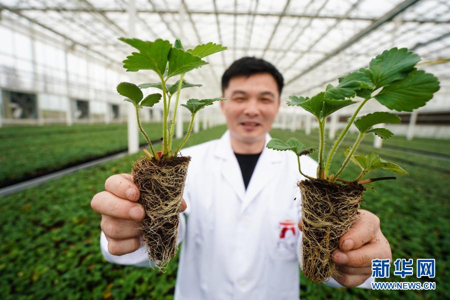 3月13日,在南京市溧水区傅家边精品草莓生活馆,工作人员在展示培育的草莓苗。新华社记者 季春鹏 摄