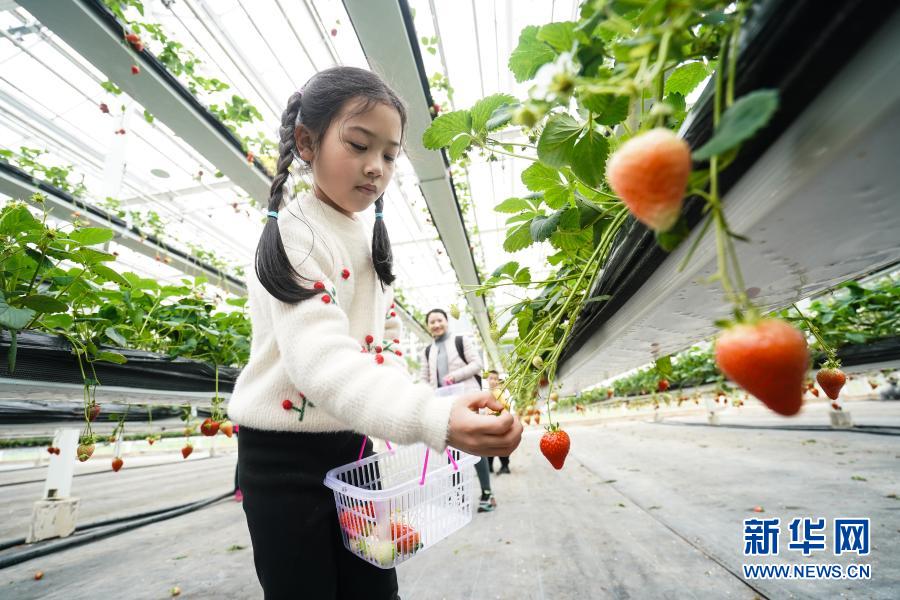 3月13日,在南京市溧水区傅家边精品草莓生活馆,游客在采摘草莓。新华社记者 季春鹏 摄
