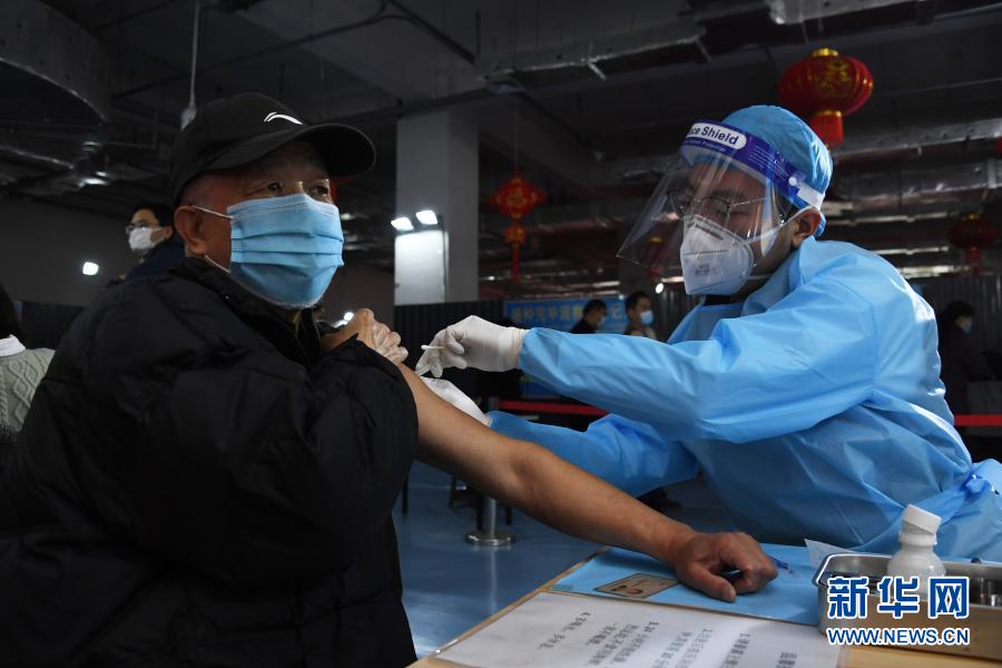 3月14日,在北京市海淀区永定路街道新冠疫苗临时接种点,医护人员为社区老年人接种。新华社记者 任超 摄