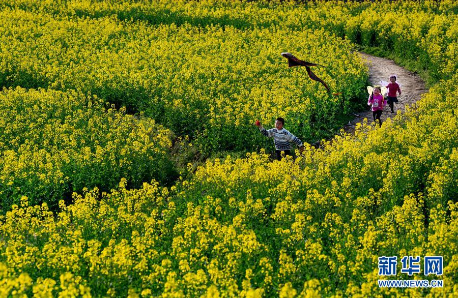 3月13日,小朋友在汉中市洋县城郊的油菜花海里放风筝。