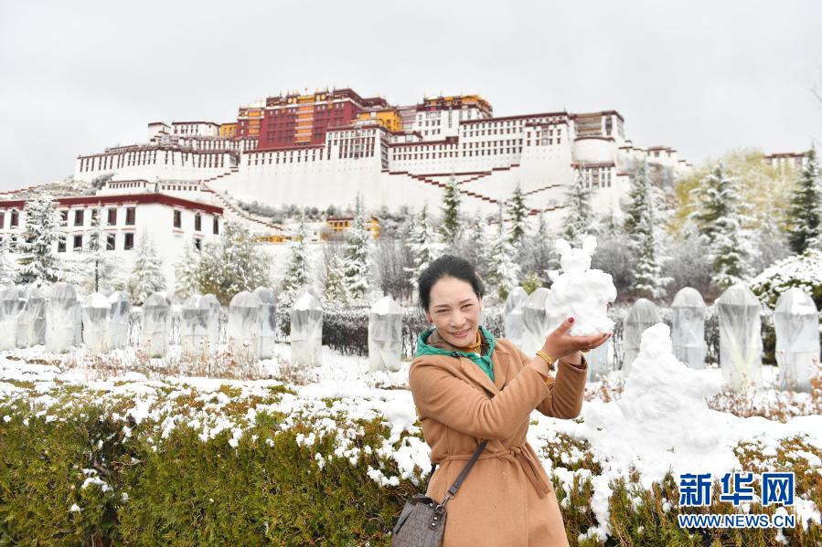 3月14日,在布达拉宫前,一名路人举起一个雪人留影。