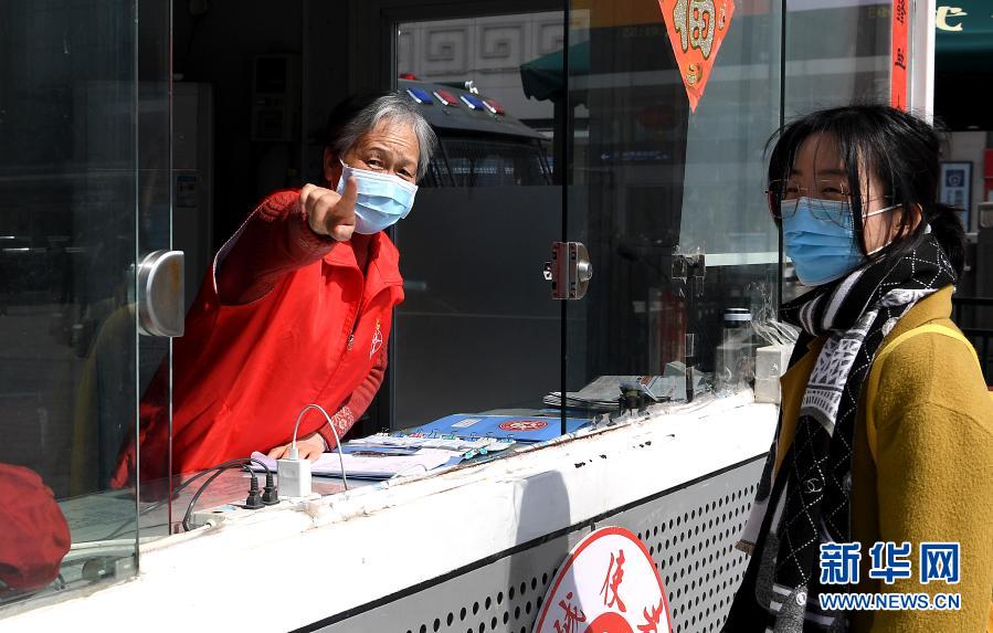 姚淑英在郑州火车站西广场志愿服务站里为旅客指路(3月9日摄)。新华社记者李安摄