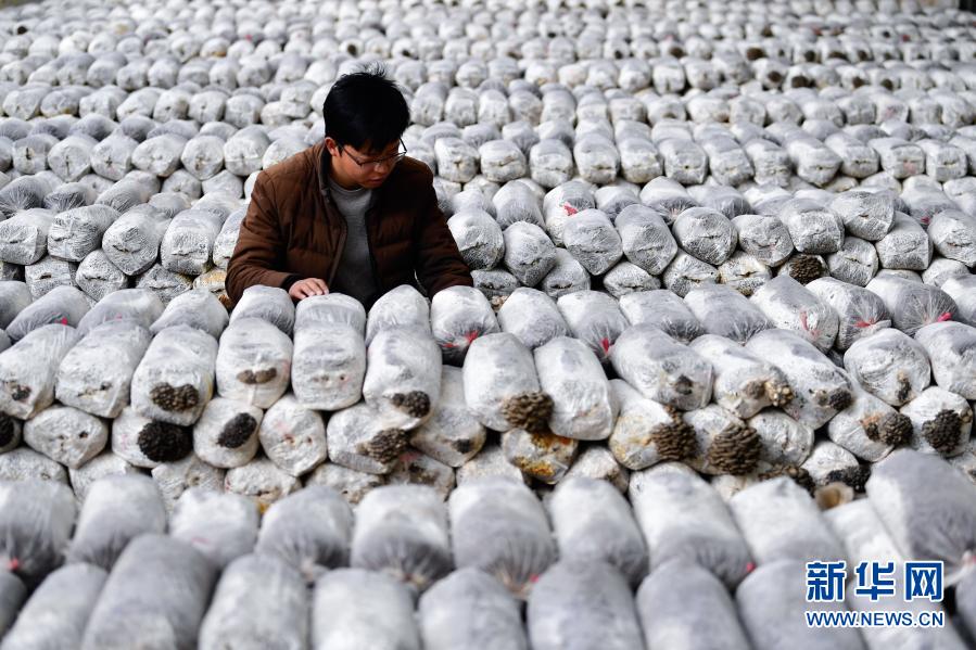 3月14日,在青海省果洛藏族自治州农牧业生态科技示范园内,农业技术员宋建东在查看平菇生长情况。