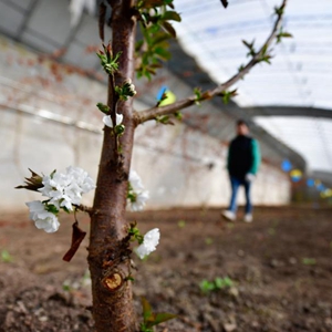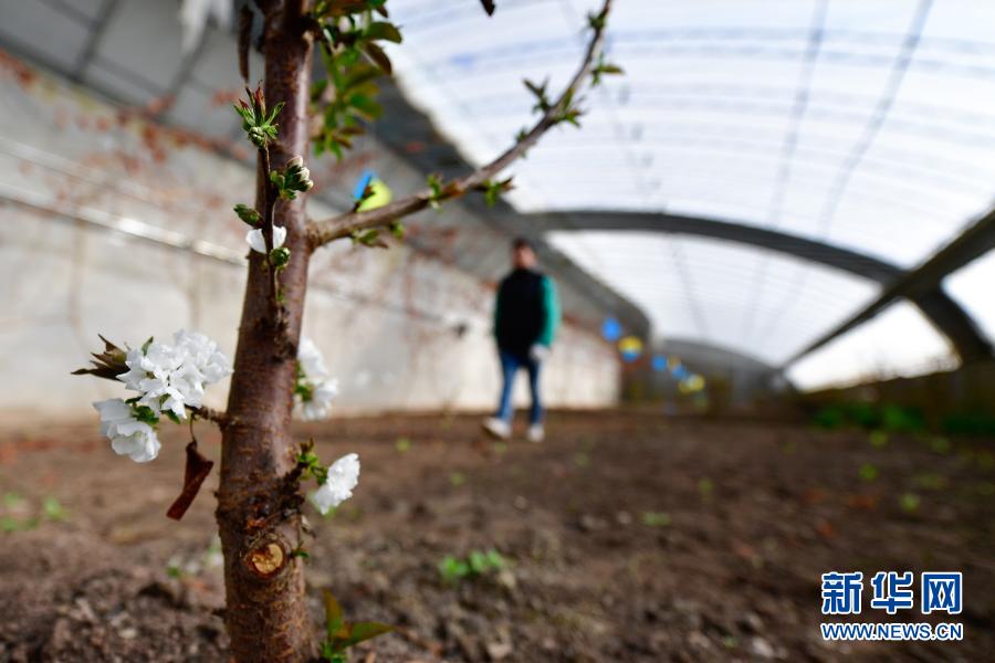 3月14日,在青海省果洛藏族自治州农牧业生态科技示范园内,农业技术员冷治在樱桃树种植棚内工作。