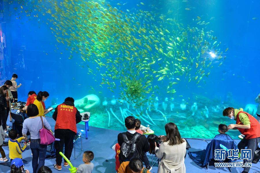 3月14日在合肥海洋世界拍摄的游客免费理发现场。