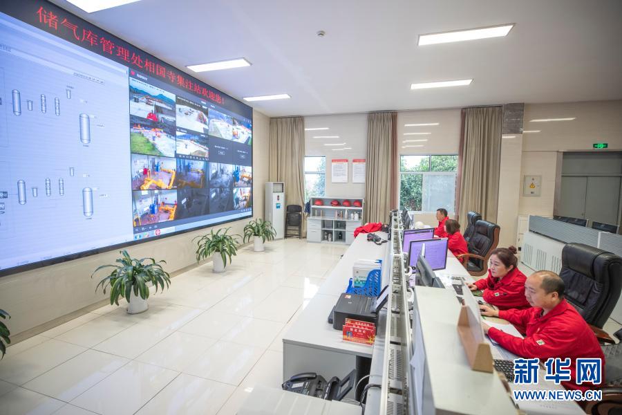 3月14日,在中国石油西南油气田公司相国寺储气库总控室内,工作人员监看作业现场的情况。新华社记者 黄伟 摄